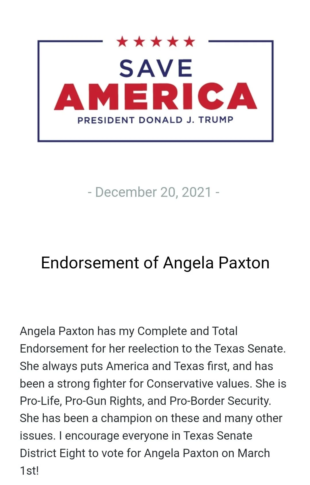 December 20, 2021 (Allen, Texas) -- Today former U.S. President Donald J. Trump endorsed Angela Paxton in her re-election campaign for Texas Senate District 8. Trump touted her conservative credentials on issues like gun rights, pro-life, and border security in his endorsement.
